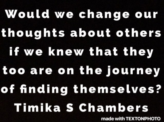 Everyone’s journey is different….Everyone has his or hers own struggles….We all have our own expertise to bring to this world… We evolve at different rates. We all have our own learning curves. Do we see and focus on the good in others or the fear/evil/ hatred in others?