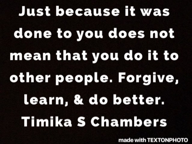 You are more than your circumstances. I believe it is true that we need not waste our time in captivity of blame, guilt, and shame. If someone has treated you less than idea or humane, do not give them the power to continually hurt you again by thinking of them. If our thoughts determine who we are, then why would we want to be less than who we are because of what someone else has done to us? The power of forgiveness is just that powerful. Lift yourself to new heights today by forgiving someone you perceive has done you wrong. There is still too much pain lingering in this world and too much life to enjoy. Let’s stop the circle of fear, pain, and hatred.