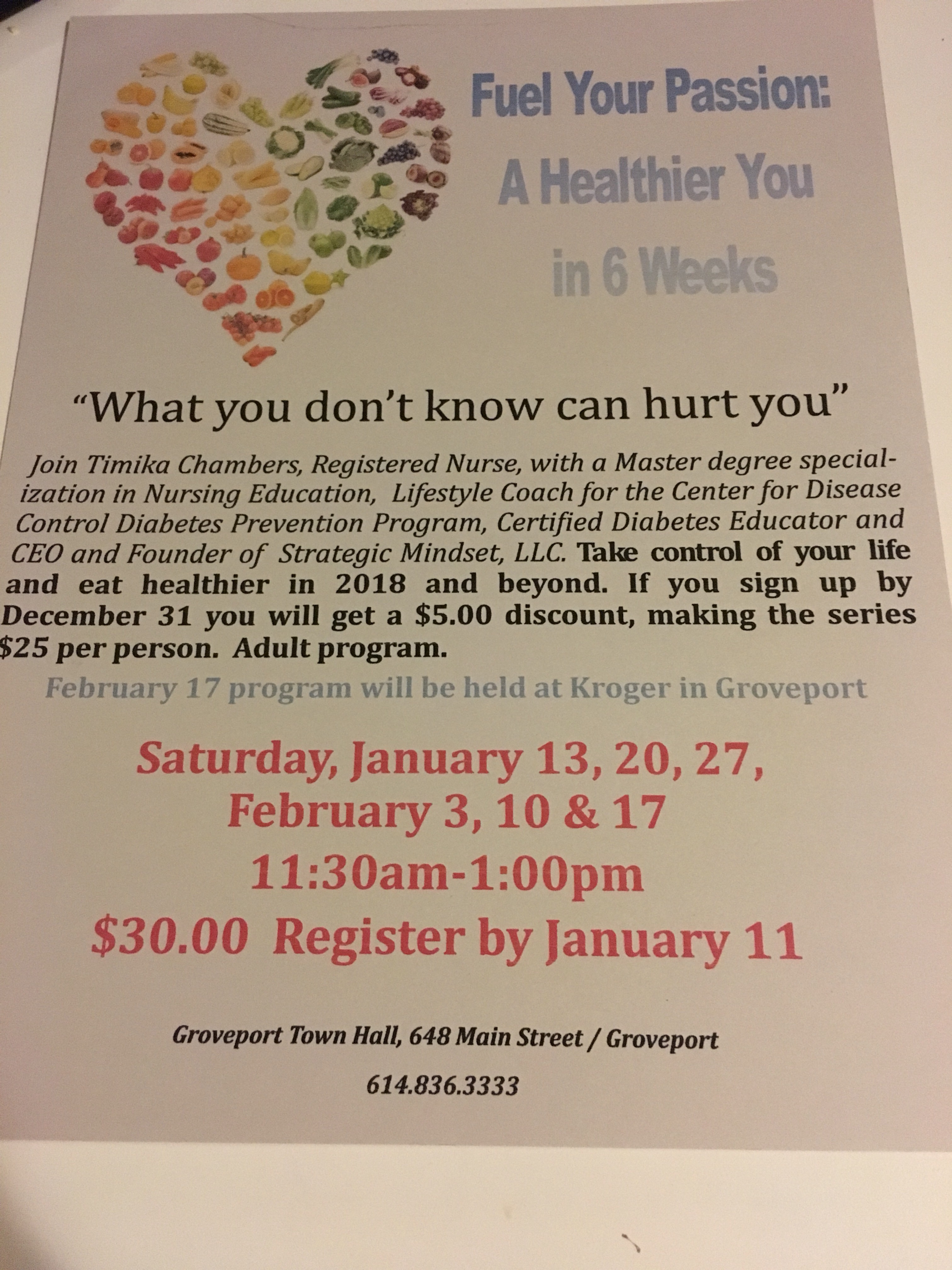 Just two days left in the New Year to receive a discount on my 6- week program Fuel Your Passion. This program will take place in Groveport, Ohio. Please sign up and register today. In this course, we will dispel myths about food, create an individualized grocery list, learn about the healing properties of food, create and sample meals and snacks. I look forward to serving you.