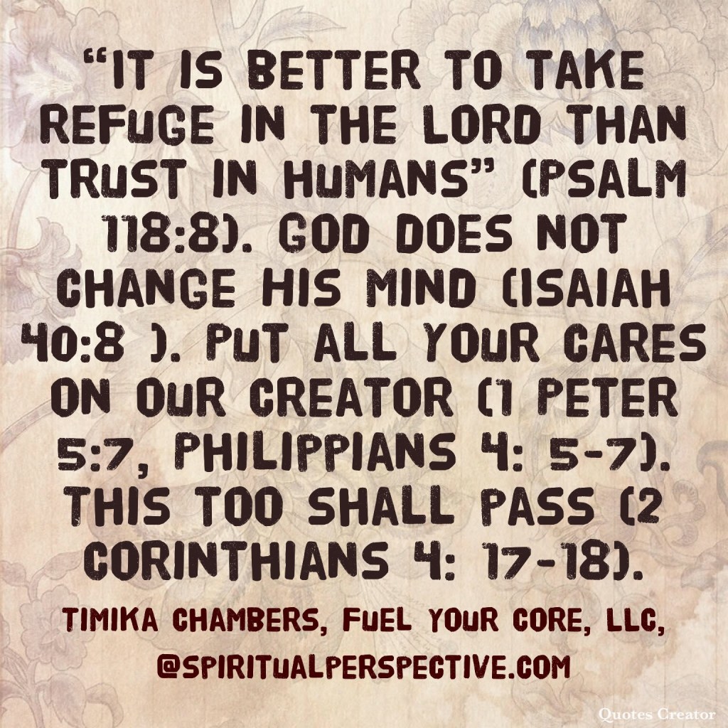 Life-draining emotions and feelings such as anger, anxiety, envy, resentment and worrying occurs when we take our eyes off the one entity that is in control. God is not wishy-washy. Hold firm to His promises, and He will see you through, not the President or other elected officials. Remember that all things work together for good, for those who love God and are called to His purpose (Romans 8:28).