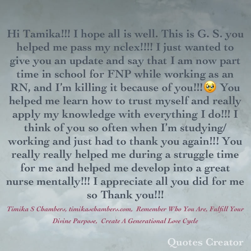 “My nursing journey has definitely not been easy, and I personally have had many different obstacles that held me back from reaching my goals, such as being a repeat NCLEX test taker! Reaching a point of desperation, I was finally led to Timika and was able to work with her through passing the nclex! Timika has helped me in ways I didn’t even know I needed. She taught me how my test anxiety can truly sway my performance and taught me ways to change the way I think completely, kick anxiety to the side, and refocus my self and frame of mind! We worked hard through every content area of the nclex. We broke down questions and found keywords that led me to answer questions correctly every time! Being able to dissect every area of the NCLEX, doing countless amounts of questions, AND speaking through content have led me to my success and finally passing!! I just want to thank Timika for being calming and so supportive when I didn’t believe in myself!!!