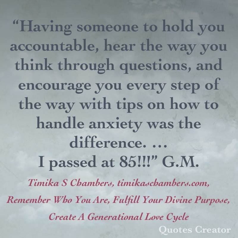 Testimony E. “Thank you so much, Timika, for your encouragement. The way you made me view questions was what made the difference. I could see you clapping for me, screaming, and telling me to calm down and read the question again. Every day, you send me words of encouragement. Like I always say, you are the best. Thank you, Timika. From the first day you called me, I knew you were all I needed. Thank you.” A.