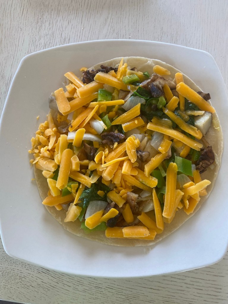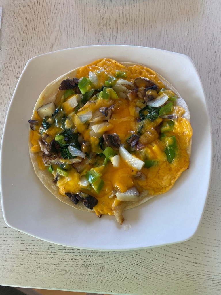 I used a soft tortilla shell and added scrambled eggs, potatoes, and sautéed bell peppers, onions, mushrooms, Tillamook Sharp Cheddar Rustic Cheese, and spinach. I baked the pizza @ 350 for approximately 10 minutes.