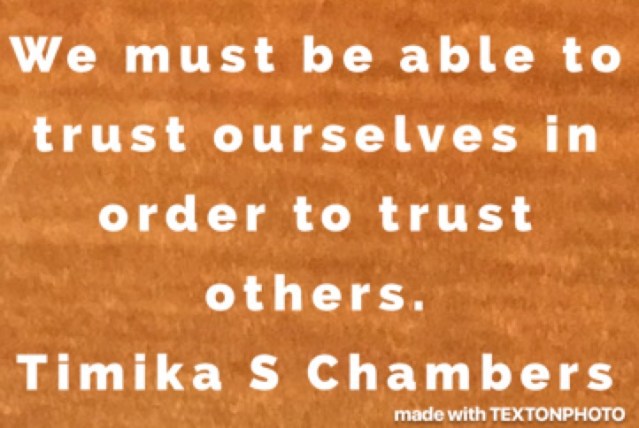Trust is more than a five-letter word. Trust affects your relationship with yourself and others. I am learning that regardless of the disappointments and frustrations, I need to trust myself and be in a position to trust others or at least give them the benefit of the doubt until otherwise noted.