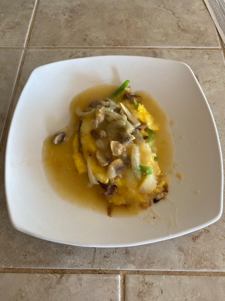 One day my husband to a small restaurant in Ohio. With curiosity, I ordered the roast beef omelet. Today, I made another version of this delicious omelet, and it was scrumptious!!!😍😁❤️. I added some thin slices of roast beef, mushrooms, bell peppers, and mozzarella cheese. In addition, I added onions to my leftover egg foo young gravy.